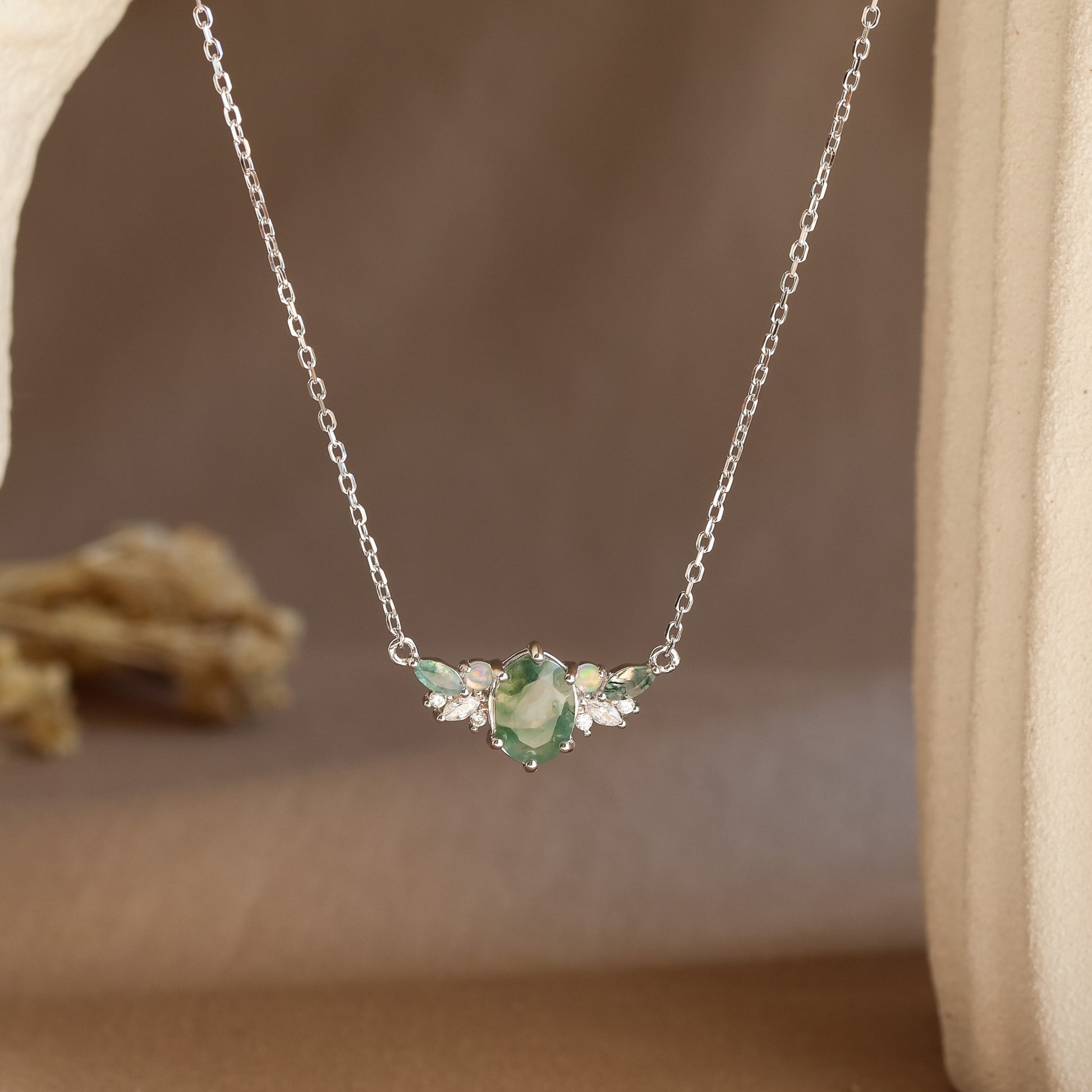 This elegant necklace combines natural beauty and sophistication, featuring a moss agate centre surrounded by luminous opal accents and sparkling cubic zirconia stones. The delicate design is set in high-quality gold vermeil, blending durability with luxury. Perfect for layering or wearing solo, this piece adds a touch of charm to any outfit.