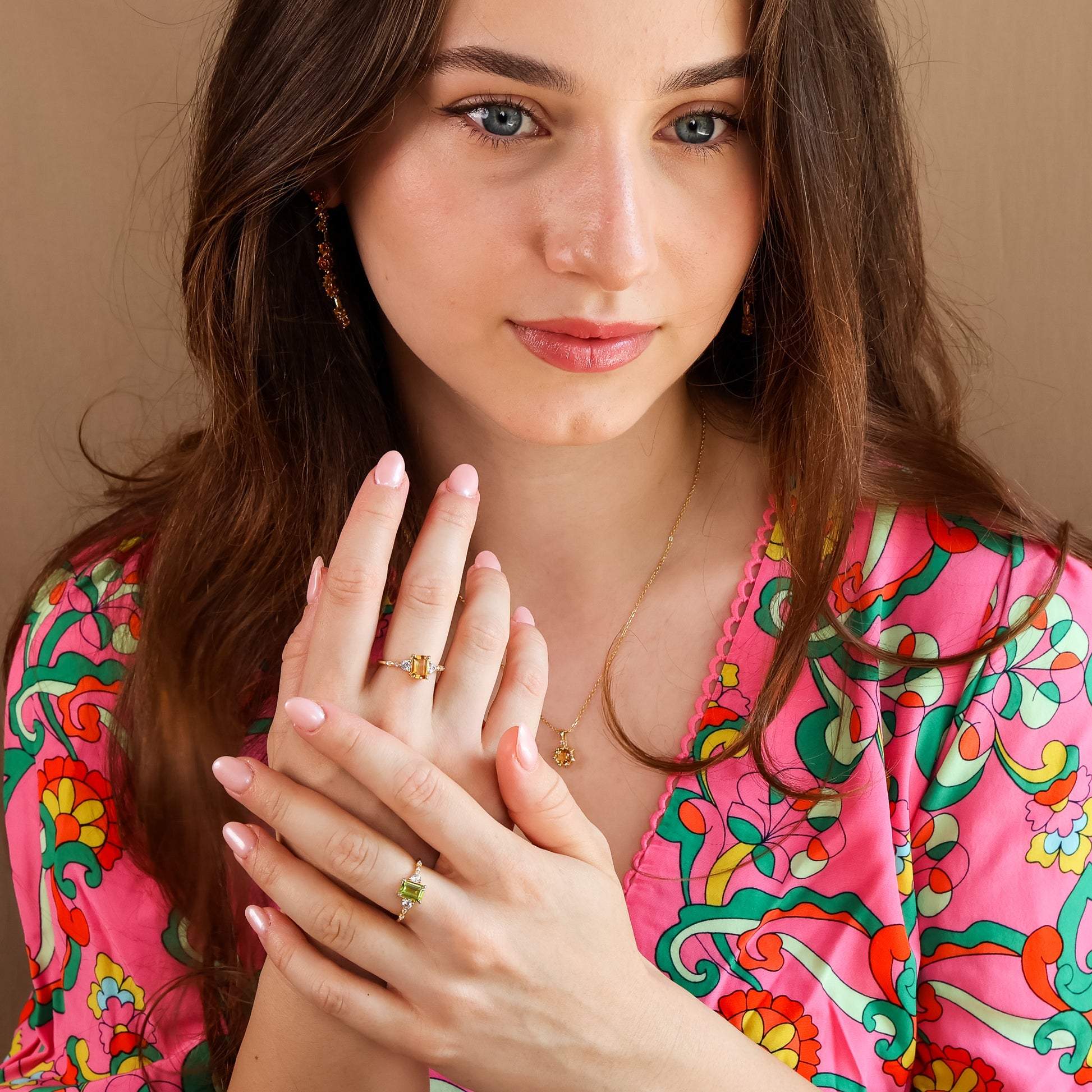 Radiating timeless elegance, this 14k gold vermeil ring features a striking emerald cut lab genuine blue sapphire at its centre, flanked by sparkling white accents for added brilliance. As the birthstone of September, sapphire is known as the stone of wisdom and royalty, believed to attract clarity, truth, and spiritual insight. Its deep celestial hue is both regal and calming, making it a perfect gift for yourself or a loved one. Whether worn alone or stacked, this ring brings sophistication and symbolic strength to any jewellery collection.